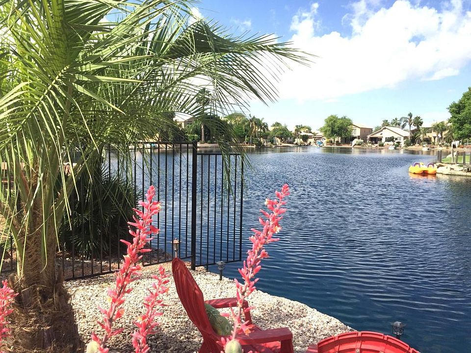 WOW! Gorgeous waterfront property! This stunning re-modeled cul-de-sac beauty showcases awesome views to the water, vaulted ceilings, a spacious great room and plantation shutters. The open concept kitchen boasts beautiful new granite countertops, new stainless steel appliances, beautiful tile flooring, new carpet and new paint throughout. The luxurious master suite features patio access, his and her closets and sinks with beautiful new over-sized tile shower. Expansive patios for relaxing plus adorable sunroom. Luxurious upgrades throughout! An award winning community with pool, spa, BB and tennis courts, parks and in A+ school district. Close to golf, shopping, walking and biking trails, 101 and 202 frwy. You will love how this home feels when you enter through the front door.