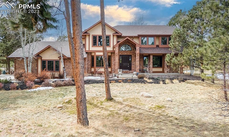 Meander up the driveway, front path of this 3.8-acre corner lot graced by peaceful whispering pines in established Bent Tree in Monument, CO. Brick entry greets you to a grand 2-story home, which beautifully marries traditional formal living spaces and perfect rooms for casual family gatherings or entertainment. An updated kitchen includes gorgeous granite countertops, professionally painted cabinets, expansive island for entertaining, gas range and newer refrigerator. Step down into vaulted family room with fireplace, wall of windows/door bring the sunshine and forest in. Eating nook leads to an updated, expansive composite deck and 1/2+acre fenced yard with raised garden beds, firepit. Main level French door office with closet + attached bath provides possibility for main level bedroom. Retiring to your master retreat brings the relaxation of a spacious room and luxurious bathroom with peak-a-boo Pikes Peak view; a loft separates you from additional upper bedrooms and full bath. Not only does this basement have a generous recreation room for tv, game tables, movie night; but also a fantastic 3-tap system bar, custom top adorned with beer caps from around the state. You’ll also appreciate a specious bedroom, fantastic exercise room, 9'6"x5'4" in-bathroom sauna, as well as ample storage. Updates from the roof to the windows and the well pump to electrical upgrades too numerous to list, adding energy efficiency and enjoyability to forest living. Extensive hardwood floors and newer windows. Three individual garage doors lead to depths of 21', 23' and 31'. On this treed property, you can also park your RV on a road-base parking spot short- or long-term based on visibility from street. Award-winning elementary! Enjoy the great outdoors on community walking paths or area trails like Mt Herman, Spruce Mountain, Fox Run, Lincoln Mountain, and more! Easy access to I-25 and Hwy 83 for commutes in every direction. Come home to the forest, where you’ll never want to leave.