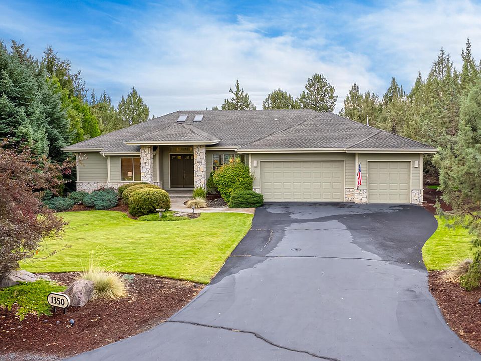 This fabulous single-level is situated on the 18th fairway of The Ridge Course at Eagle Crest Resort offering breathtaking views and a serene setting. The great room features a built-in entertainment center and display shelves, creating a focal point for gatherings and relaxation. Enjoy meals in both the formal dining room and the cozy breakfast nook, overlooking the beautiful landscape. The kitchen is a chef's delight, with an island, breakfast bar, walk-in pantry, and newer stainless appliances. The office provides a quiet space to work or study, while the guest half bath adds convenience for visitors.