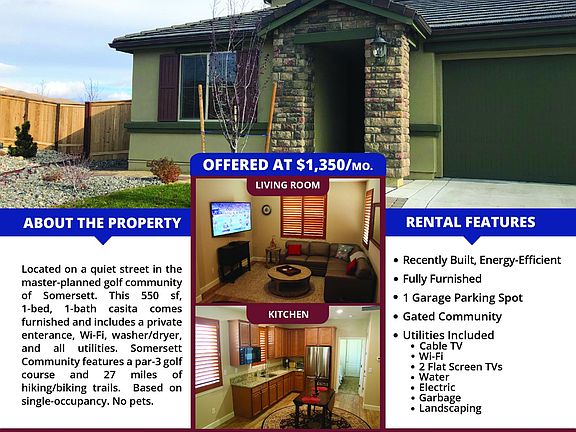 Located on the golf course on a quiet street in the master-planned community of Somersett. This 550 sf, 1-bed, 1-bath casita comes fully-furnished and includes 2 smart TVs, Wi-Fi, washer/dryer, all utilities (cable, Wi-Fi, water, electric, garbage). Somersett Community features a par-3 golf course and 27 miles of hiking/biking trails. Rent is based on SINGLE-OCCUPANCY. NO PETS. NO SMOKING. Available January 4th, 2021. Rent based on single-occupancy. No pets. No smoking. All utilities included. Fully furnished. Cleaning Fee - $250 (non-refundable). Deposit- $1,350 (refundable).