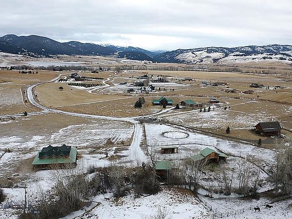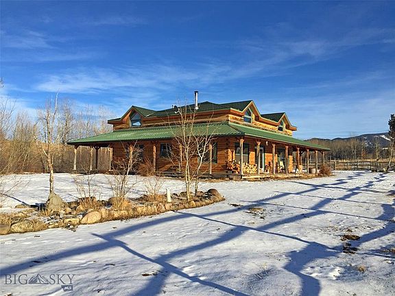 Custom Log Home, 5 acres with Creek on property. Panoramic views of Spanish Peaks, Gallatin Range, Ted Turner Conservation Land, and the Valley. Located between Bozeman and world class skiing of Big Sky. A minute away from Gallatin River fishing access and trailheads of Gallatin Canyon National Forest lands. Horse ready corrals w/ Loafing Shed/Tack Room, Multi-use/Hay Barn with loft, and Automatic Stock Waterer. Property is completely fenced. 2,680 sq ft log home with Wraparound Porch. New roof and new carpeting. Large open living area with high vaulted ceilings and large windows, master bedroom opens to the wraparound porch, walk in closet and master bathroom with dual showers, mud room, and utility room. Upstairs: family area, 2 bedrooms and 1 bathroom. Guest Cabin/Storage Shed w/ loft and Patio that overlooks creek. Creek runs trough entire backside of the property with trees and wildlife.