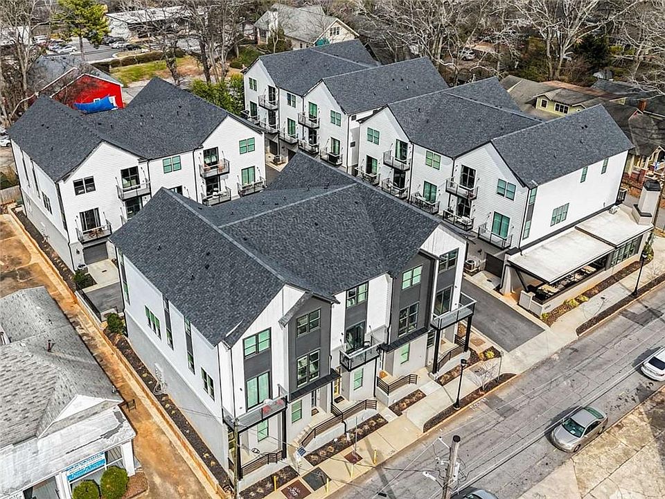 VILLAGE STACKS TOWNHOME IN EAST ATLANTA VILLAGE: Fee simple, 3 level townhome located in the heart of bustling East Atlanta Village, just 0.80 mile to The Beltline and 2 blocks to Brownwood Park; between downtown Atlanta and Decatur, convenient to Midtown and Emory/ CDC, providing easy and quick access to downtown, the airport, multiple highways, as well as Atlanta’s major business districts. Built by Epic Development, just two years old, meticulously maintained. First floor bedroom functions best as a home office or work-out room. The main level is designed for entertaining; neutral brown wooden floors; living room, with floor to ceiling windows and a dramatic sputnik chandelier, could work as a private dining room; oversized windows, sliding glass doors, and tall ceilings contribute to a light and bright atmosphere; kitchen features painted grey cabinets, white quartz countertops with a waterfall island (bar seating for three or four), modern chrome faucet and hardware, and dove grey herringbone tile backsplash; stainless steel Whirlpool appliances include smooth-top range, dishwasher, microwave, and Samsung French door refrigerator with water/ice dispenser; spacious dining area could be reversed with the living room; one of two balconies opens from the dining room, large enough for a café table and chairs. Private top floor contains two bedroom suites; primary bedroom suite features double vanities, an amply sized stand-up shower with frameless glass, and a walk-in closet; the second balcony opens from the primary bedroom; a second bedroom, with en-suite bathroom, rounds out the top floor; laundry is conveniently located on the top floor. Custom blinds throughout; two car tandem garage with room for storage. Village Stacks has a community clubhouse with a lounge area, fireplace, and outdoor seating. The surrounding area provides excellent livability and conveniences from a mix of grocery stores, vibrant neighborhood retail/ restaurants (Banshee, Argosy, Octopus Bar)/ and nightlife (The Earl, Mary’s), exciting mixed use destinations such as Glenwood Park and The Atlanta Dairies (including a food hall).