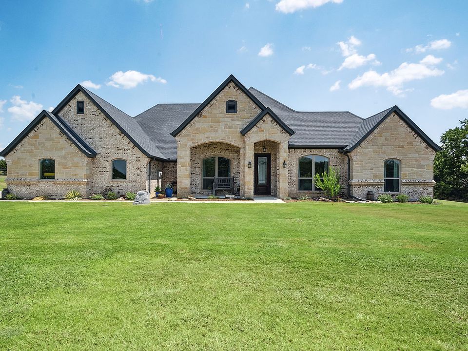 Stunning home on 2 acres in the highly sought-after Peaster ISD! This exceptional property offers an expansive open floorplan, highlighted by vaulted ceilings, walls of windows, crown molding, and hand-scraped hardwood floors. The spacious living room is anchored by a wood burning stone fireplace. The large kitchen features a massive island with a breakfast bar, custom solid wood cabinetry, granite countertops and walk-in pantry. Enormous primary suite boasts a spa like bath with soaking tub and walk-in shower with rain shower head above. Split secondary bedrooms. Large office. Step outside to your beautifully landscaped backyard with extensive patio overlooking the back pasture. Wonderfully fenced. Ready for your horses with 2 stall shedrow barn. No HOA! Easy access to Downtown Weatherford.