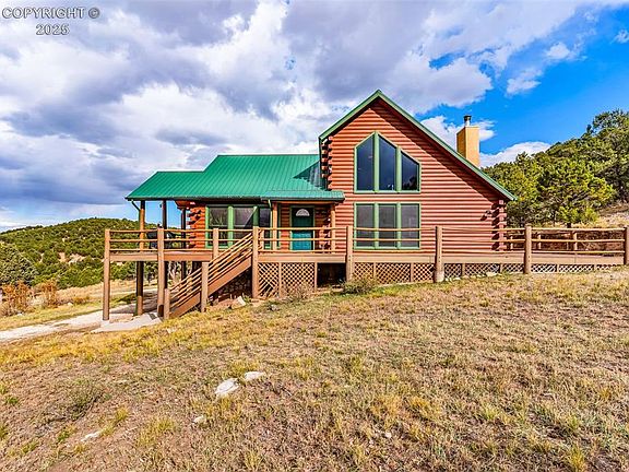 Tucked at the base of Mitchell Mountain, this extraordinary custom log home offers an unparalleled serenity. Located within the prestigious Bull Domingo Ranch subdivision, loved for its equestrian lifestyle, vast BLM access, and proximity to DeWeese Reservoir, this property embodies refined rustic living at its finest. Spanning 35 private acres & 3,026 square feet of handcrafted log construction, this residence showcases three bedrooms and three baths designed with timeless craftsmanship and exceptional attention to detail. The open-concept great room impresses with dramatic vaulted ceilings, rich oak hardwood floors, and expansive windows that frame panoramic mountain views. A beautiful log staircase leads to a lofted suite featuring a spa-inspired bath with a jacuzzi tub and a private deck where you can take in sweeping vistas of the mountains. Vaulted tongue-and-groove ceilings and natural wood textures create a warm, inviting ambiance that blends comfort and elegance. This home is in pristine condition and priced below market value for a quick sale. The sellers have recently completed thoughtful upgrades, including all new kitchen appliances, new countertops, the addition of gas service to the kitchen, and a water filtration system. The exterior logs have been completely retreated, and a brand-new water heater has been installed, ensuring this exceptional property is move-in ready and meticulously maintained. Outdoors, discover your own private haven, complete with a detached three-car garage and workshop, along with charming country touches such as a chicken coop. With Mitchell Mountain as your backdrop, enjoy direct access to hiking trails and endless opportunities to explore nature in complete privacy. Perfectly positioned along maintained roads and just minutes from the picturesque town of Westcliffe, this exceptional mountain retreat offers a rare opportunity to experience elevated rustic luxury where tranquility, craftsmanship, and natural beauty converge.