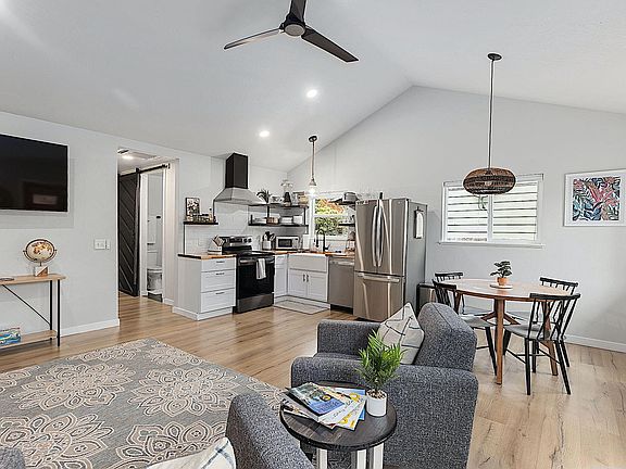 Welcome to 1350 NW Conklin Ave. This delightful cottage seamlessly combines comfort and style. Located in the sought-after northwest area of Grants Pass, this 2 bedroom, 1 bath home offers an open floor plan, vaulted ceilings, and fresh laminate flooring. The kitchen is a highlight and features beautiful butcher block countertops and brand-new stainless steel appliances. Bathed in lots of natural light, the home exudes a cozy ambiance. Outside, the backyard is spacious and private with a large covered patio. Make your appointment today to view this renovated gem!