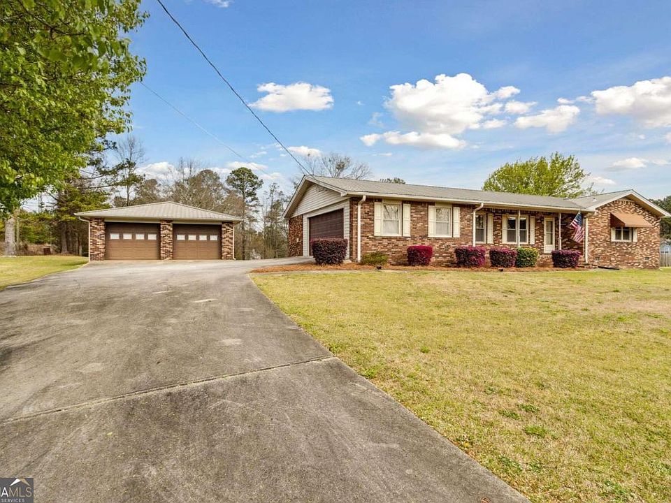 Great 4 Sided Brick Ranch sitting on 1.97 acres, with no HOA. Hardwoods throughout the home. The home has a 2 car side entry garage & a 2 car detached garage with an additional covered parking on the back. Kitchen has a breakfast nook as well as a dining room. Family room with a stone fireplace, & a built-in entertainment system. Huge Backyard surrounded by trees & an outdoor shed. Rocking chair front porch, long driveway, and plenty of yard room. The home is located near downtown Lawrenceville where you can find many dining options, as well as shopping, and recreation usages such as a huge local park with a playground and occasional live music and a downtown square area by the courthouse. Only minutes from Tribble Mill Park with lake, walking trails & more.