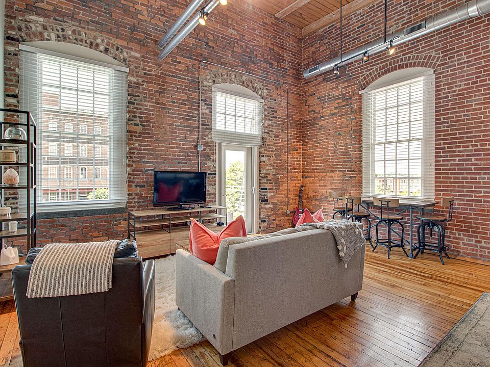 Incredible corner unit featuring exposed brick, soaring ceilings and windows, original hardwood floors, a balcony overlooking one of two pools, updated kitchen and bathroom, all in a great location! This complex also includes a great fitness center, bocce ball, gym and outdoor grill area all included in HOA fees Furnishing not included in price, but are available for purchase.