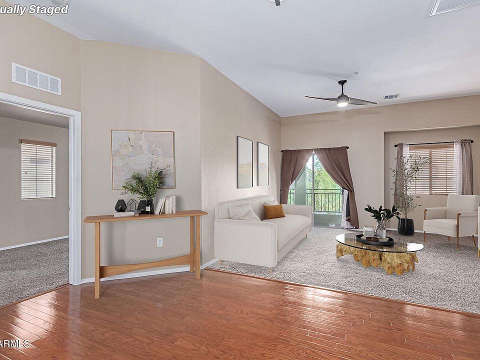 Welcome to this charming & move-in ready 2-bedroom townhome! Inside, find a warm and inviting living room that flows effortlessly into the dining area, creating an ideal space for everyday living and entertaining. Features like upgraded ceiling fans & light fixtures, a blend of wood-look & carpet flooring, vaulted ceilings, fresh neutral paint, and lots of windows. The kitchen is open to the great room and includes a breakfast bar & under cabinet LED lighting. In the primary bedroom, there is sliding glass doors to the balcony, an ensuite bathroom with upgraded black hardware, and a walk-in closet. Newer HVAC, roof & hot water heater. Steps away from the resort like community park, green belt & pool. Perfect location to freeways, dining & shopping in both Mesa & Gilbert. Welcome Home