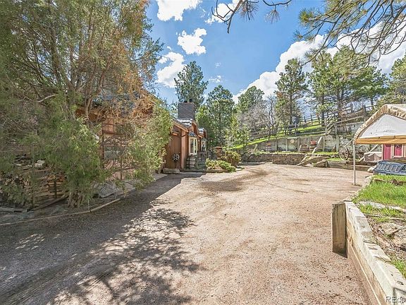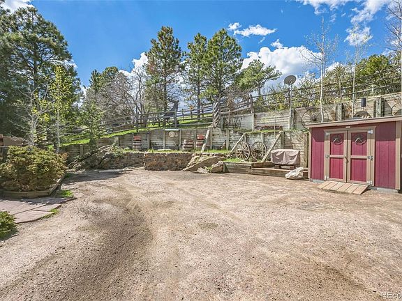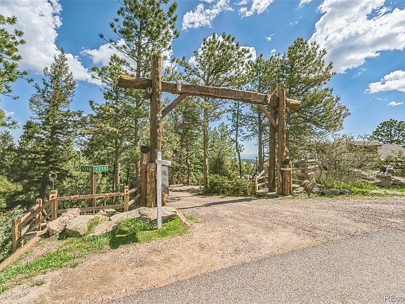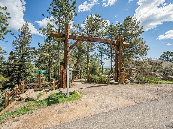 FANTASTIC 4 bedroom 3 bathroom house located in the mountains west of Golden at an elevation of 7500' with stunning views of the Denver metro area with an additional 70 plus miles east to the clearly seen horizon. Be prepared for a grand entrance to the property with a HUGE wood timber structure announcing your arrival along with a 24" flag pole.. This property is over an acre of Ponderosa forest, has a 16' fire pit, a generous amount of "yard art" and is part of a 39 home community with one entrance which offers privacy but has a close 1+1/2 mile access to I-70. Home offers vaulted ceilings, renovated bathrooms, stainless steel appliances, a gorgeous wood-burning fireplace with stone surround and an open floor plan. Included are 2300 square feet of decking located on 3 levels with open views of Denver and beyond. The attached garage is 24' x 24', propane heated, large work bench, pull down stair case for storage and plenty of lighting. Hot water is supplied by an owned solar collection system with 160 gallons of hot water storage along with a 52 gallon water heater (new in 2022) as a back up. Roof is made of concrete tiles. Lawn area is irrigated by auto sprinkler system. Each of the 4 bedrooms has direct access to outside deck. A natural earthy environment with a close connection with nature is a strong positive of this location. Sunrise is a truly spectacular sight. Come up and check out this home and see its "one of a type" location."