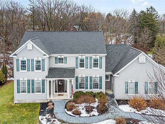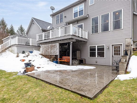 Now Available, an IDEAL Family Home in the desirable Sage Brook neighborhood of Webster. Relax this summer on the elevated 2-tier, 400sqft of decking overlooking this peaceful wooded setting. Or, sit/lay out in privacy on the stamped concrete patio & enjoy the ambiance of the In-Ground "Tranquility" Waterfall! Mill Creek (branch) flows through the rear border of the property. An Abundance of Interior Living Space (Total approx. 3,484sqft) includes the professionally finished walkout basement. Center entrance Colonial Style home has an EZ 1st floor plan, light & bright, w/gorgeous hardwood floors you have a formal dining room, along w/living/family combo room featuring gas fireplace. Also, an updated Eat-In kitchen w/quartz counters, high end cabinetry & center island w/breakfast bar. New Sliding Door out to Deck. Enter from the 3-car garage & you have the 1st floor bathroom/mud room/laundry. 2nd floor has Primary Suite w/spacious bedroom, jacuzzi tub, & large walk-in closet. Additional 3 bedrooms & 2nd full bath upstairs. SOLAR PANELS on garage roof offer BIG $$$ Savings on your monthly utility bills! 1 Mile North is Lake Ontario. Sunrise/Sunsets/Fishing @ the Webster Pier & enjoy the many amenities of Webster Park. Well-built backyard playground & tree house will remain. Try growing your own veggies this year using the fenced in raised bed garden! Bonus, Storage Shed Included. Delayed Negotiations on file. Offers will be reviewed beginning Wednesday, March 12th @ NOON