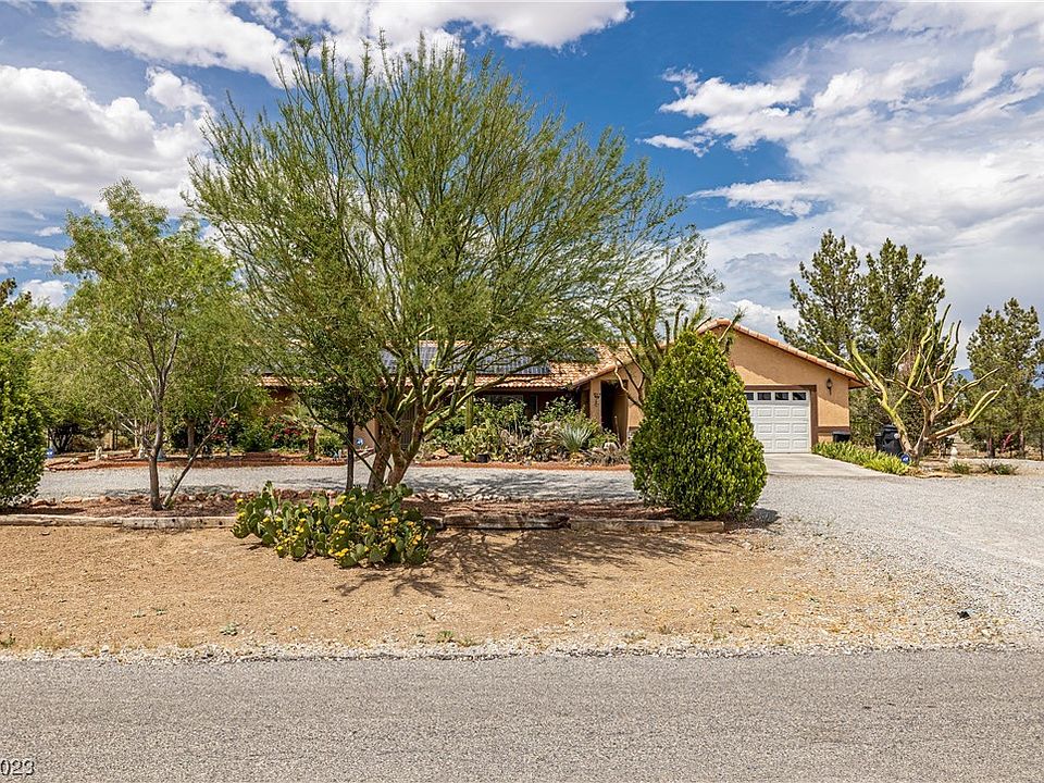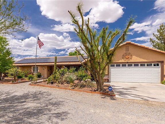 This lovely 3 bed 2 bath 2 car garage home sits on over an acre of land with private well and septic. Found in the heart of Pahrump just minutes away from town center, this home also offers solar panels for the energy conscious. Circular gravel driveway leads to the rose lined front entrance. Recently remodeled kitchen with new cabinets and granite countertops. Freshly painted kitchen and living areas. Alarm system with doorbell, newer AC system. Primary bathroom offers an upgraded tub/shower combo with grab bars. Enclosed room on the back of the home measures appx 13x25 is climate controlled and completely finished for an additional living space of appx 300 sf. Fenced back yard boasts several fruit bearing trees, grape vines, green grass, irrigation system, cooled and humidified greenhouse, and storage shed. Room for your horses in the back metal stalls round out this lovely home. Not enough room here to list all the amenities. Come see it today and fall in love with country living.
