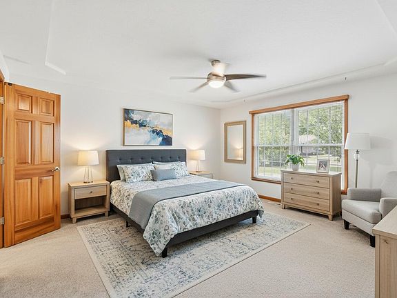 Welcome to this beautifully maintained brick ranch offering a spacious and versatile layout with both main-level comfort and a fully finished lower level. From the moment you arrive, the home's inviting curb appeal shines with a brick façade, bold red shutters, and a neatly landscaped yard. Step inside to an open-concept design where the living, dining, and kitchen areas flow together under vaulted ceilings, creating a bright and airy atmosphere. The kitchen serves as the heart of the home with abundant cabinet storage, pantry, stainless steel appliances, a new stainless sink, and a breakfast bar for casual dining. A sliding door leads directly to the backyard, perfect for indoor-outdoor entertaining. The adjacent living room features skylights and a cozy fireplace, blending comfort with style. The primary suite is a private retreat with an ensuite bath featuring a double vanity and a large walk-in closet. Additional thoughtful touches on the main level include a linen closet and laundry hookups for convenience. A finished two-car garage with new entry and garage doors provides added storage and easy access. Downstairs, the finished basement expands your living space with a recreation room, half bath, and two storage rooms. A dedicated media room is wired for surround sound, while a sound-insulated flex room offers endless possibilities as a home office, hobby space, gaming area, or music studio. A guest bedroom with an egress window completes the lower-level layout, providing comfort and privacy for visitors. Recent upgrades include a new furnace, tankless water heater, dishwasher, refrigerator, and Ethernet wiring to every room, ensuring both modern efficiency and connectivity. The home is mostly carpeted with hardwood flooring in select areas for a warm, inviting finish. Located in a desirable neighborhood close to schools, parks, shopping, and commuter routes, this move-in ready home balances style, comfort, and functionality.Schedule your private showing today