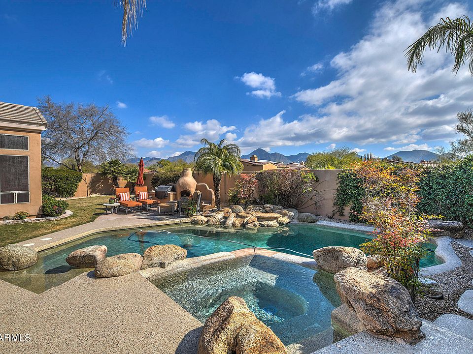 This RARE home is the ONE you have been WAITING FOR! Fabulous Curb Appeal w/ a private Premium location & glorious Mountain Views, this home is mesmerizing rain or shine. The luster of hardwood flooring & travertine, high ceilings, spacious rooms all provide an inviting ambience. Lrg master suite is complete w/ sitting area and 2 lrg walk-in closets. Plantation Shutters throughout. Updated Master bath & 2nd bath rm w/ Restoration Hardware faucets, mirrors & accent lighs. Beautiful Kitchen & cupboards w/ bead board accents open to lrg family rm w/ dramatic Views & Rear yard has Heated pool w/ water feature & Heated spa w/ water overflow into pool. A Resort like space w/ gas fire place & Outdoor BBQ close to Patio. Garage & pool deck recently updated. Watch the moon rise over the McDowells Every room facing East has tall windows to take in the beautiful mountain views from Sunrise to Sunset & with a Wash directly behind the home, this only adds to the view as well as the privacy for this home owner. Don't miss this one! It is quite simply an extraordinary home.