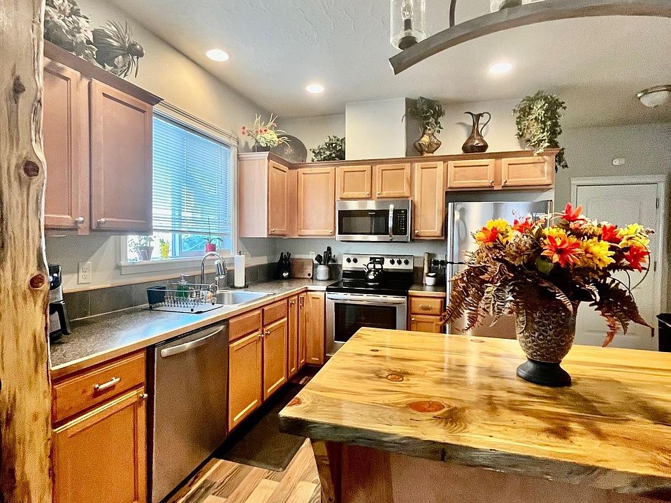 • Bath-Master, Bed-Master Main Level, Walk-In Closet(s), Breakfast Bar, Pantry, Kitchen Island, Wood/Butcher Block Counters, Number of Baths Main Level: 1, Number of Baths Upper Level: 1