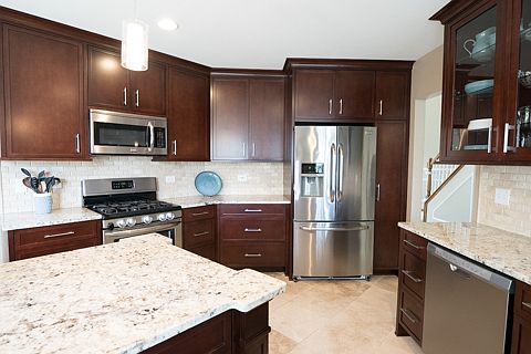 Discover all Plainfield has to offer living in this gem of a home in Harvest Glen! Not a design detail was missed in the kitchen remodel, from the pendant lighting over the island down to the beautifully tiled floor. Kitchen features include high end granite countertops, stainless steel appliances and 42" cabinets with soft close drawers. Island with ornate granite design accommodates seating for five. Second level counter behind sink opens to family room with fireplace, perfect for entertaining. Main floor foyer is open to living and dining room with 12" ceilings, architectural archways and columns, all complimented by wide plank, cherry hardwood floors. Bedroom for a playroom or office as well as laundry conveniently located on main floor. Dual staircases lead up to loft area and four bedrooms, including the spacious master suite with "his and hers" walk in closets, tray ceilings and luxurious private bath. Tastefully finished basement with space for family recreation and entertainment, with separate workout area and plenty of space left for storage. Step outside under the pergola and enjoy the evening in the fully fenced backyard. All this in award winning Plainfield School Districts. Don't miss this one!
