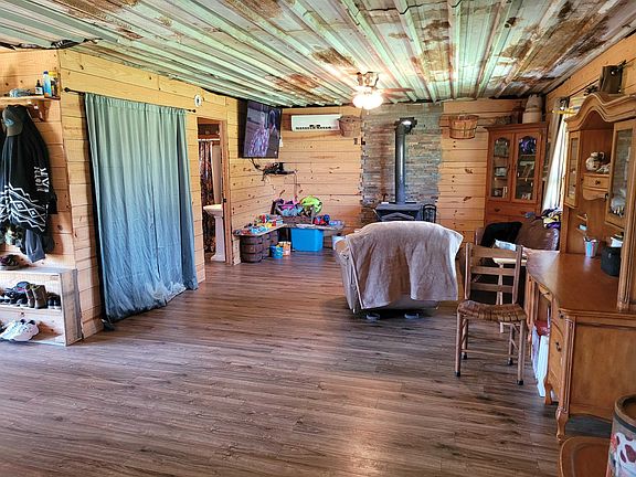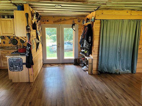 Country living just minutes from Lake Oconee! This barn-style home is full of rustic charm, featuring pine wood plank interior walls and metal ceilings. Open floor plan on the main level features living room/kitchen combo with full bathroom and laundry closet. Upper level includes primary bedroom with on suite bathroom, as well as a second bedroom with attached bathroom. Property also features storage shed, small guest house with its own septic system, and fence surrounding property with solar powered gate.