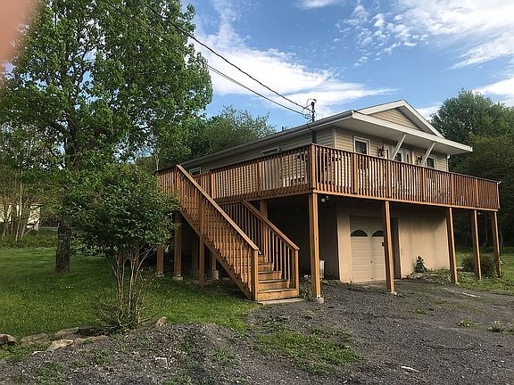 Great Starter home just remodeled with laminate flooring and fresh paint throughout. This 2 bedroom 1bath home is move in ready. Living room has cathedral ceiling, stone fireplace and sliders leading you onto the wrap around deck. Dining area also has cathedral ceiling and overlooks front deck. Galley type kitchen with electric range and refrigerator. Bathroom has been remodeled with ceramic tile. Laundry room comes with washer and dryer. Full unfinshed lower level is full of great potential. Finish off for a family room and a man cave! Pellet/corn stove in lower level. Large yard, Circular drive and Garage! Dont miss seeing this home!