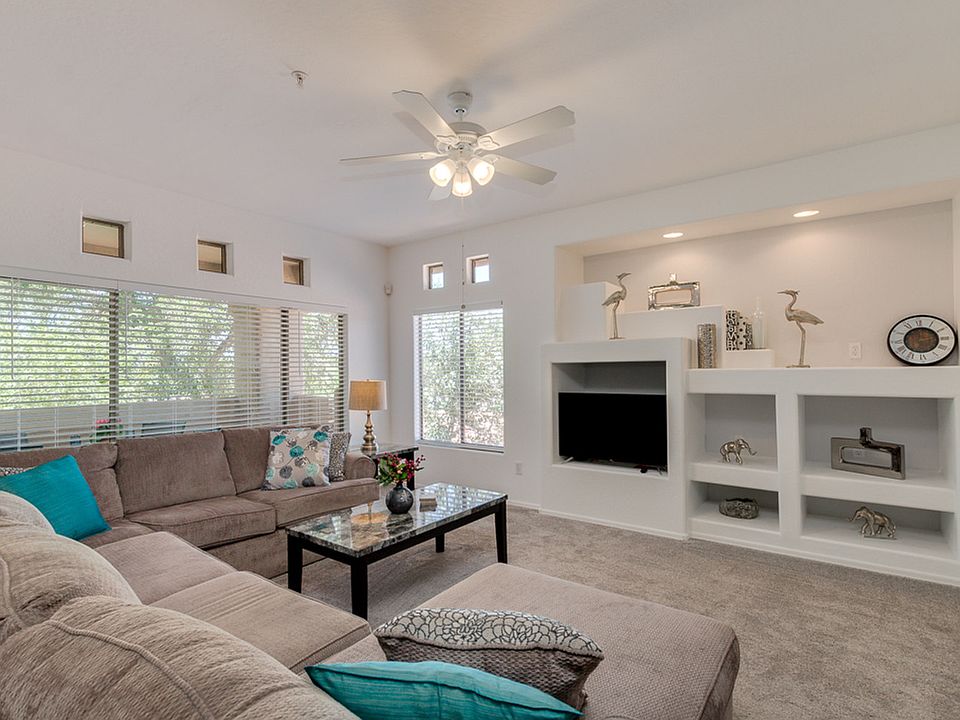 This spacious 2-bedroom, 2-bath condo in the heart of Chandler is a dream. With 1,350 sq ft of contemporary design, this 2nd-floor unit offers privacy and style. The open-concept kitchen and living area feature stainless steel appliances, a breakfast bar, and a comfy sectional with a large TV. Relax on the west-facing balcony with green views, perfect for outdoor dining and grilling. Both bedrooms are master suites with private baths, walk-in closets, and one with a TV. Enjoy the convenience of in-unit laundry and the community's heated pool, spa, and scenic grounds. The open-concept kitchen and living area feature stainless steel appliances, a breakfast bar, and a comfy sectional with a large TV. Relax on the west-facing balcony with green views, perfect for outdoor dining and grilling. Both bedrooms are master suites with private baths, walk-in closets, and one with a TV. Enjoy the convenience of in-unit laundry and the community's heated pool, spa, and scenic grounds.