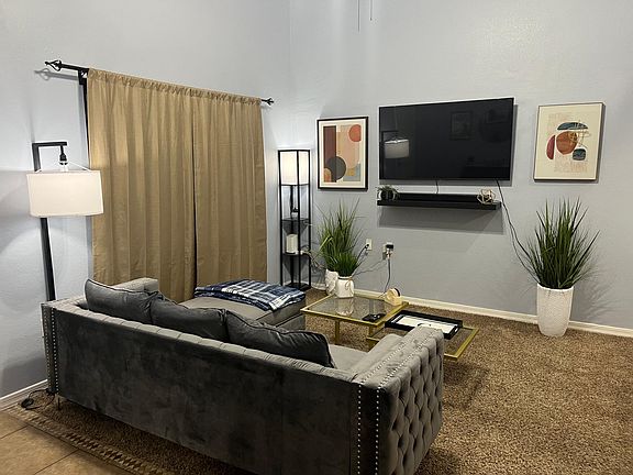 Fully furnished and utilities/wifi included! 3-9 month terms, lease length affects rate (rate shown is for 9 month lease). Contact for month-to-month rates. Welcome to our fantastic condo in Chandler, Arizona! Located just 5 minutes away from the vibrant downtown Chandler and a short 20-minute drive from both downtown Phoenix and Scottsdale, our property offers a prime location to explore the best of Arizona. Step inside and be captivated by the grandeur of high vaulted ceilings and an open living room, creating an inviting and comfortable space for you and your guests. The large master bedroom with a cozy queen bed also boasts a dedicated office corner with two monitors, providing you with the perfect space to stay productive during your stay. There are 2 air mattresses that are also available for use. One of the highlights of our condo is the beautiful spiral staircase that leads to the upstairs loft, where you'll find a delightful home theater complete with a projector, power reclining seats, and a popcorn machine! Enjoy movie nights and entertainment like never before, creating cherished memories with loved ones. The kitchen is fully equipped with a bar top for eating, cookware, and pots/pans for cooking, making it convenient for preparing delicious meals during your stay. You'll also find a Keurig coffee machine with provided K cups, ensuring you have a fresh cup of coffee to start your day. The upgraded bathroom features a new stand-up shower, adding a touch of luxury to your stay. Step outside to the furnished outdoor balcony, complete with privacy shades, offering a serene and private setting for relaxation or socializing. Our quiet and peaceful neighborhood is the perfect haven to unwind and recharge. Take advantage of the swimming pool and hot tub, perfect for unwinding and enjoying some leisure time. Flexible lease terms ranging from 1-9 months (rate shown is for 9 month lease). Half month's rent deposit due after application is approved. Pets allowed at owner's discretion. 1 reserved covered parking space, open parking available in front of unit. Renter has access to all community amenities including pool, hot tub and tennis court.