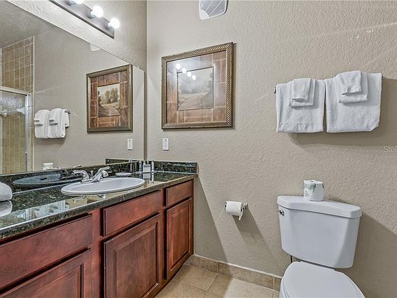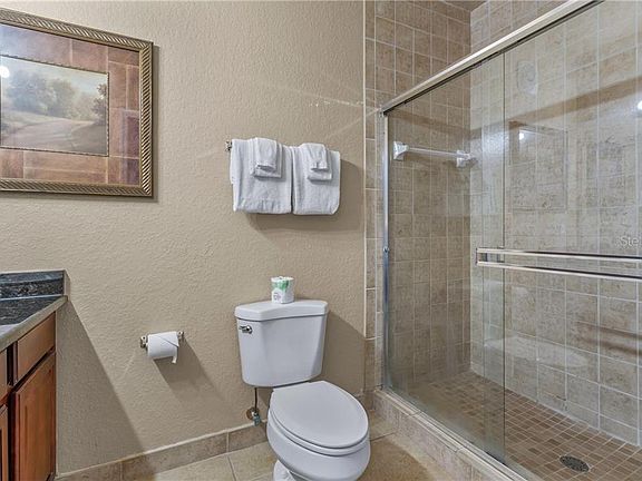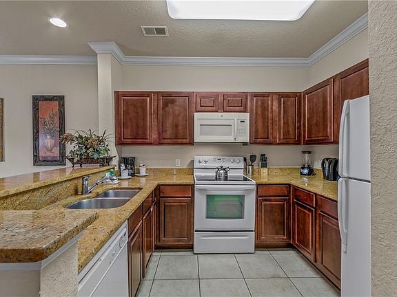 STUNNING second story condo in the popular community of Tucana Resort in Champions Gate. This beautiful 3-bedroom/2-bath condo features 1,244 sqft. of living space and is being sold fully furnished and turnkey. This condo is located in Building #8 which is towards the back of the community, quiet and secluded. This home was previously on a short-term rental program, but it would also be great for a single-family residence or vacation home. Enjoy an open floorplan with beautiful upgrades including crown molding throughout, granite countertops and ceramic tile flooring in the kitchen and bathrooms, laminate wood flooring in the dining room, and plush carpet in the living room and bedrooms. There is a beautiful kitchen with a breakfast bar that opens to an elegant dining room and open living room. Sliding doors from the living room lead to a private screened lanai with beautiful views and plenty of room to entertain your guests. The master suite is spacious and has a large closet and adjoining bath with granite vanity and floor to ceiling custom tile shower. The bedrooms are split, and two bedrooms are located privately at the back of the unit and share a beautiful guest bathroom. Enjoy amazing community amenities including a clubhouse with a fitness center and large heated pool, kiddie pool, spa, restaurant & lounge, spa, playground, picnic area with grills, and a movie theatre. HOA fees include cable, internet, phone, water, and trash removal. Enjoy living tucked away in a gated community, yet close to theme parks, championship golf, and excellent shopping and dining options. Call us today for your private tour!