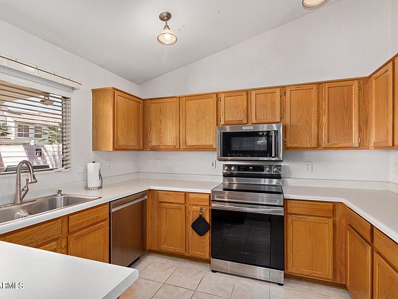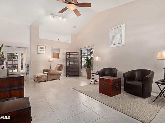 Don't miss out on this delightful single-level home nestled in the sought-after Festival subdivision! Boasting 3 bedrooms, 2 bathrooms, and a newer A/C installed in 2022, this home offers a perfect blend of comfort and convenience. Upon entering, you'll be greeted by vaulted ceilings and a soothing neutral color palette that creates a warm and inviting atmosphere. Durable ceramic tile flows seamlessly in all the right places, adding both style and practicality. The welcoming living room effortlessly transitions into the fantastic eat-in kitchen, where you'll find SS appliances—including a smooth cooktop range/oven, built-in microwave, dishwasher, and refrigerator, along with plenty of cabinet and countertop space, with a desirable breakfast bar. The spacious dining area provides ample room for hosting family gatherings and entertaining guests. Step outside to the extended covered patio and enjoy the splendid backyard, offering a relaxed environment to dine alfresco, an outdoor fireplace to gather around on those chilly nights, and a built-in BBQ for hosting summer get-togethers, this outdoor space is sure to impress. Retreat to the primary bedroom, complete with an ensuite bathroom featuring dual sinks, a glass-enclosed walk-in shower, deep soaking garden tub, a large walk-in closet, along with private access to the back patio. The two additional bedrooms, laundry room, and 2-car garage round out the well-designed floor plan. Conveniently located within walking distance to Anderson Elementary and Middle schools, and just a short drive to popular restaurants, convenient shopping, and the Loop 101 freeway for easy commuting, this home offers everything you need for comfortable living. Don't wait - submit your offer today and make this house your new home!