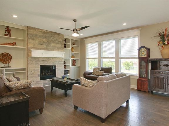 Walk inside to your 12 ft ceiling dream home on a private oversized lot. When you walk in you will notice the beautiful hardwood floors throughout the main living area. Split layout makes your master suite private. Quartz countertops, large island with plenty of space to prep and eat. Open living room with gas fireplace, covered deck access dining and coffee bar space. Private covered deck looks out to tree row and farm land. Master suite has connected office space, large double vanity sinks, tiled shower with walk in closet attached to laundry room. Basement offers large rec room with under-stair reading nook and future dry bar space. Have instant equity by finishing the 2 bedrooms in the basement! You won't find this much space on this large of a lot anywhere else in the neighborhood!