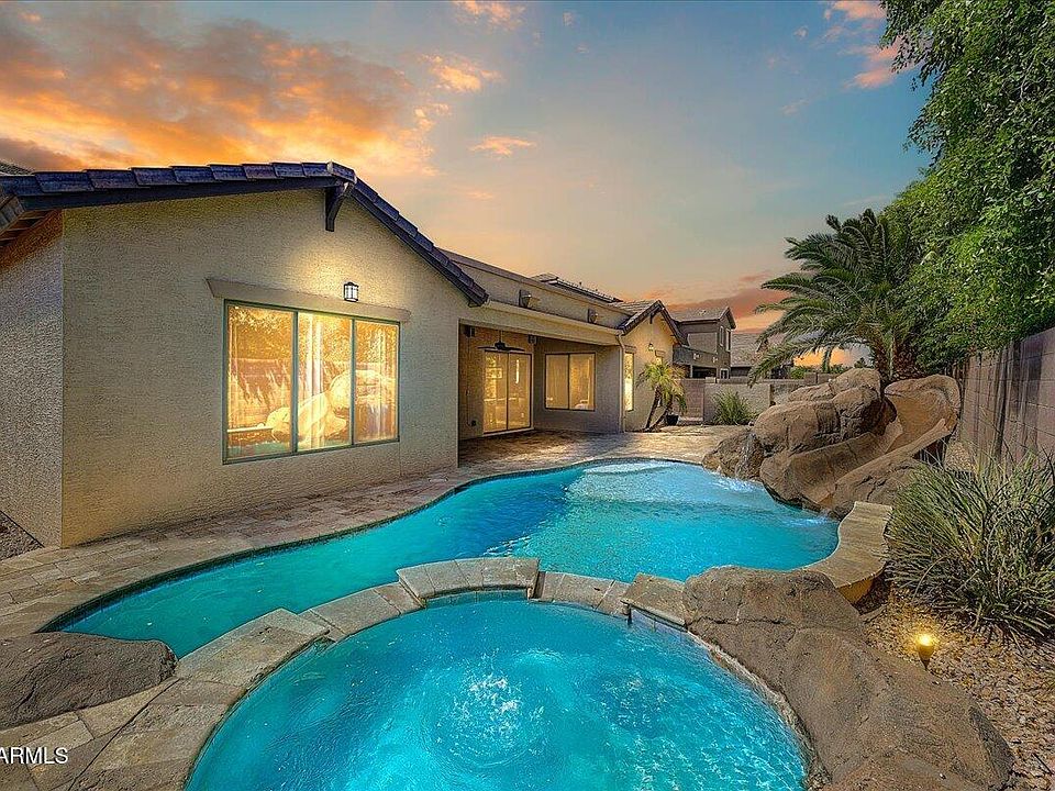 Step outside to your backyard oasis and discover the ultimate space for relaxation and entertainment. The sparkling pool features a beautiful waterfall with a thrilling slide that flows into the water, and tucked beneath it is a hidden grotto perfect for cooling off or relaxing in the shade with a drink in hand. The wrap-around spa with powerful jets and its own cascading waterfall offers the perfect place to unwind; while the covered patio provides space for outdoor dining and gatherings. This backyard is truly designed for both fun and relaxation - a resort experience right at home.