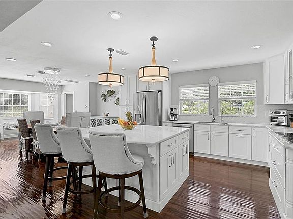 Under contract-accepting backup offers. Welcome to this absolutely stunning Mill Creek retreat, perfectly positioned on a spacious 1-acre corner lot with serene pond views. This beautifully updated two-story pool home includes two new AC units with a 10-year fully transferrable warranty (2025) two newer water heaters (2019/2025) newer roof (2017) new gutters, shutters, irrigation, reverse osmosis system and fenced yard. Relax in this peaceful setting that is truly a sanctuary with a screened lanai overlooking your private pool or unwind beneath the oversized retractable awning. The fully fenced yard offers peace and privacy with no rear neighbors, a side-entry garage and plenty of parking – including room for an RV, boat or potential outbuilding! Inside, no detail has been overlooked – from gleaming hardwood floors and a custom wood-burning fireplace to marble countertops, stainless steel appliances, wine fridge and soft-close cabinetry. The open-concept design features soaring ceilings and thoughtful finishes throughout. Upstairs, the private primary suite includes dual walk-in closets and a luxurious ensuite bath with a massive walk-in shower and dual vanities. Enjoy full automation capabilities with the app controlled front door, garage door, washer, dryer, thermostat and ring doorbell. The alarm system monitors all windows and doors and includes motion detector sensors, 4 exterior cameras and an interior camera. The refrigerator door has a Krupps coffee maker attachment and the primary bath showerhead has a Bluetooth speaker. Bonus features include a charming storage shed that could be converted into a workshop and a putting green to practice your golf game! Located in the highly sought-after community of Mill Creek that offers large lot properties and architectural diversity so lacking in today’s new communities, with easy access to I-75, top-rated beaches, airports, dining and more – this one truly has it all!