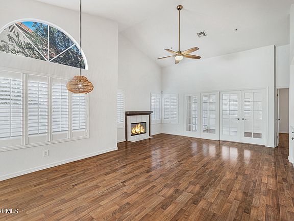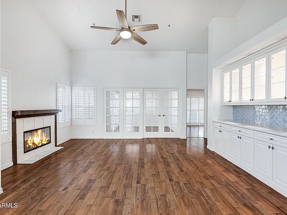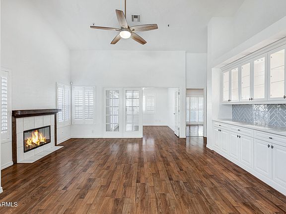 Discover serenity in this picturesque patio home located in prestigious North Scottsdale. As you enter, you are captivated by the inviting ambiance created by wood-like plank flooring, plantation shutters, and lofty vaulted ceilings. The expansive living room is a versatile space, adorned with an exquisite glass-paned display case seamlessly built into the wall, illuminated by accent lighting. A charming wood-burning fireplace adds a touch of warmth, making family gatherings during the holidays even more memorable. Adjacent to the living room is a private den, exclusive to this floorplan, that is enclosed by glass-paned French doors and access to the backyard. The kitchen boasts a modern aesthetic, featuring stainless steel appliances, pristine white quartz countertops, and an accented tile backsplash. The main bedroom retreats into its own sanctuary, providing private access to the backyard. The ensuite bathroom provides dual vanity sinks and a walk-in closet with built-in cabinets. Step outside and you are welcomed to a secluded backyard with an L-shaped covered patio, complete with a misting system and lush vegetation. The garage offers epoxy floors and built in cabinets with shelving. Community also has a heated pool and spa. HOA will be painting homes in Spring of 2024.