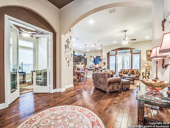 Lovingly MAINTAINED Single Story in GATED Community ~ OPEN Floor Plan ~ GLASS Doors to SITTING Area Off ENTRY ~ Neutral COLOR PALETTE ~ WOOD FLOORS Except Bedrooms & Wet Areas ~ SPEAKER SYSTEM Thru-Out ~ KITCHEN Features GAS Cooking, EAT-AT Bar, STAINLESS Appliances ~ UPGRADED GRANITE Counters w/TILE Bksplsh, PENDANT & UNDER-CABINET Lighting ~ Master BA Features SEPARATE Garden Tub & Shower & DBL Vanities ~ Large COVERED Patio ~ BRICK Borders & Rear STONE FENCE Accent Lovely LANDSCAPED Yard ~ SPRINKLER Sys