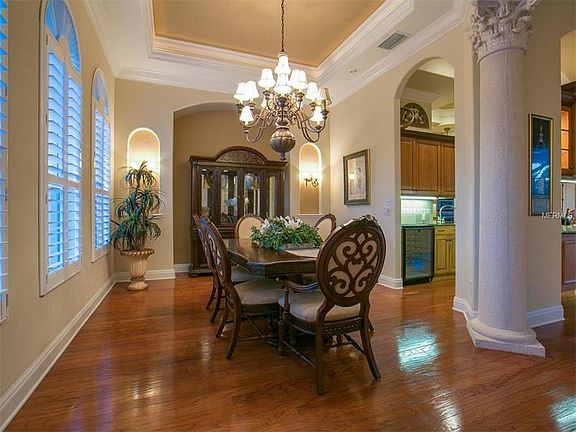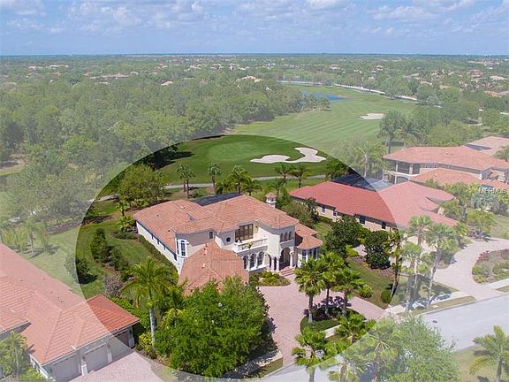 Overlooking the Arnold Palmer designed golf course in one of Lakewood Ranch Country Clubs most desirable neighborhoods, this home exudes exceptional character, finish quality, and comfortable elegance. The welcoming circular drive and classic architectural styling make a statement to arriving quests while the Living Room with coral stone fireplace and banquet size Dining Room are perfect for formal entertaining. The chefs kitchen with names like Monogram and Fisher & Paykel includes a grand island that invites quests and family to gather. Take the group outside for the ultimate outdoor experience around the tropical pool setting overlooking the course. A full outdoor kitchen, including a gas fireplace completes this picture. The first floor bonus room with full wet bar, refrigerator, ice maker, and room for a pool table or several game tables is just right for the big game. The second floor (with elevator access) provides a secluded suite for your guests including a large bonus room, two balconies, a complete kitchen and separate bedroom with luxurious bath. Architectural finishes abound with lighted coffered ceilings, crown moldings, 22 in. porcelain tile and hardwood floors throughout. Quality is everywhere, just as you would expect in a Peregrine model.