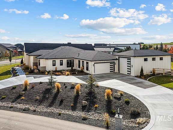 Perched in the prestigious Lone Star Ranch community, this home sits on a tree-lined 0.83-acre corner lot w/unobstructed Boise Mountain views. Every aspect of this single-level retreat highlights premium finishes & expert craftsmanship. A striking 20’ entryway leads to the great room, featuring floor-to-ceiling windows & sophisticated gas fireplace. Expansive windows fill the home with natural light, creating a warm yet luxurious ambiance. The beautifully appointed kitchen boasts built-in Thermador appliances, a stylish full-height backsplash, quartz countertops, an island/breakfast bar & a butler’s pantry. The spa-like ensuite offers freestanding tub set against an accent wall of the walkthrough tile shower & a 248 SF closet w/built-in dresser. Spacious additional bedrooms share a Jack-n-Jill bath w/private sinks. A dedicated den & guest suite (full bath & walk-in closet) sit off the foyer. Highlights: ample laundry storage, covered patio prepped for outdoor kitchen, temp-controlled garage (39' RV), & more!