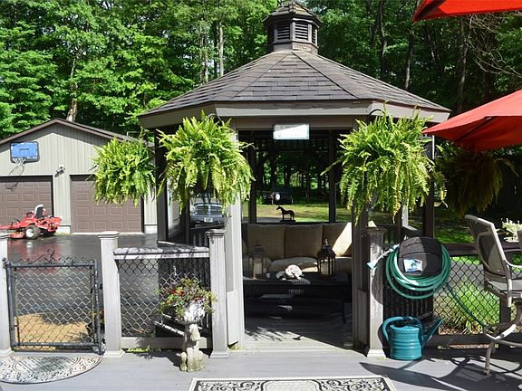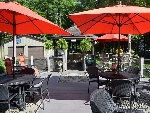 Some of the many amenities include: kitchen and all baths updated, 4 bedrooms, 4 full baths, open living concept with cathedral beamed ceiling, cedar accent wall in great room, white pine ceilings in kitchen, dining, hall areas, spacious kitchen island, 2 stone faced fireplaces, I free standing fireplace in family/game room, wall of windows in great room, spacious composite decking with gazebo, attached single car garage, detached dbl. garage, lake view, vinyl siding & vinyl shingle exterior for low maintenance. Golf cart leads to fairway 6 of Palmer designed golf course; 100 feet of waterfrontage on lake lot directly across the street!
