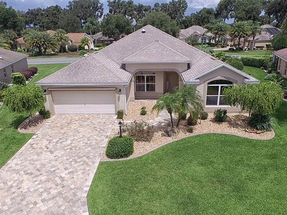 Wonderful Gardenia Model on quiet cul-de-sac in Sunset Pointe, close to both Lake Sumter Landing and Cane Garden Country Club. And just minutes from a championship and 2 executive golf courses. Lake Miona Regional Rec Center and the Hibiscus Pool are just around the corner. The exterior of this home presents an amazing first impression. Paver driveway, walkway and front porch with curbed landscape beds and rock mulch, framed by 2-tone painted walls and trim with added gutters and downspouts. The front door with retractable screen, glass arched transom window welcomes you in and down the entry hall to an open concept family room and adjoining dining room with a 12' slider that pockets 6ft which opens to the covered & screened lanai & birdcage. No homes behind! The tiled kitchen has raised panel cabinets w/crown molding, recessed lights & solar tube, roll-out drawers, solid surface counter-tops, gas range & upgraded side x side refrigerator. The owner's en suite with its own entry foyer & overhead plant shelf has a 6' slider leading to the lanai, dual closets, L shaped vanity, solar tube & side-windows providing natural light, linen closet and tiled shower. There is a separate guest wing with its own linen closet and bath featuring a combo tub & shower and transom window. The first guest room has a spacious closet while the second guest room has none so it can serve as either a bedroom or study. The inside laundry room leads to the 2 car garage with pull down attic stairs.