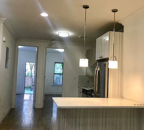 This is a Renovated 3 bedroom apartment with a Private Backyard. It's located on one of Bushwick's most desirable, quiet, tree-lined blocks and is just a few short blocks from the L train Station. Perfectly located near many retail shops, restaurants, coffee shops, banks, and Supermarkets. First month rent and One Month Security are required for move in. Application Fee per person $20 The Apartment offers: Living-room and kitchen combine, Dishwasher, New appliances, Spacious bedrooms, Newly Renovated apartment, Hardwood Flooring, Full bathroom, High ceilings, Closet space is great, Private huge backyard, Central heating, Pets upon approval