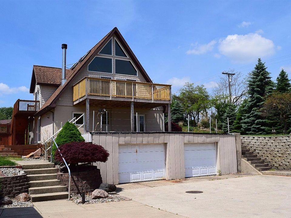 Fantastic opportunity to own a beautiful A- Frame home on 4.4+/- acres with outstanding views of huge ponds on a fabulous setting. This 2,128 sq ft, 3 bedroom, 2 bath home offers an updated kitchen with tile floor, well maintained hardwood floor in living and carpeted bedrooms, second level master suite with sliding doors to deck, family room with stone fireplace and double sliders to deck that overlook the pond. Third level can be an office or bedroom with two skylights. Basement is partially finished with additional space for storage. Two car garage attached to home plus separate 1,200 sq. ft pole barn with double door front access and a single door back access. Extra lot of 1.35 acres is included in the 4.4 acres. HOME IS IN AN ESTATE