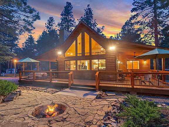 Stunning Log Sided Cabin amongst the Tall Ponderosa Pines in Forest Lakes Estates. Home and Garage are situated on a private cul-de-sac lot (40,075 sq ft) with perfectly placed Blue Spruce Trees and a grassy front yard that make for AMAZING curb appeal. The large wrap (front/sides) deck with stone fire pit is a show stopper and great for entertaining. There is also a rear deck for a little more privacy. Inside features a Great Room floor plan with Vaulted Knotty Pine ceilings, large picture windows overlooking the your lot, stone faced gas fireplace with mantel, full Service Kitchen (all appliances included) with bar seating, dining area, laundry room, guest suite and bathroom. Master Suite is on the main level, split from guest bedroom, and features an ensuite Bathroom. There is hidden