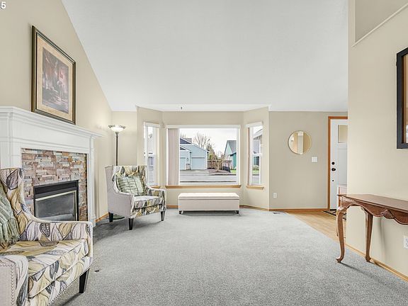 Stunning 2-story home that offers beautiful curb appeal and sits on a spacious .19-acre lot in the desirable Valley Farms neighborhood. Step inside to a bright living room with soaring vaulted ceilings, a large bay window that floods the space with natural light, and a gorgeous stack-stone gas fireplace. The open layout flows seamlessly into the dining area, featuring vaulted ceilings and a large window for an airy, inviting feel. The kitchen was remodeled in 2017 and has gorgeous countertops, stainless steel appliances, and an appliance garage for extra convenience. Just off the kitchen, the sunny family room features a glass-front door leading to the expansive deck making it perfect for indoor-outdoor living. A stylishly updated half bath completes the main level. Upstairs, the primary suite has vaulted ceilings and an updated private bath featuring a step-in shower. Two additional bedrooms and a beautifully updated full guest bath complete the upper level. Outside, enjoy the big fenced backyard with a huge 345 sq. ft. deck and a toolshed for extra storage. Fantastic location just minutes from restaurants, shopping, schools, parks, and Oregon Sportfishing Adventures!