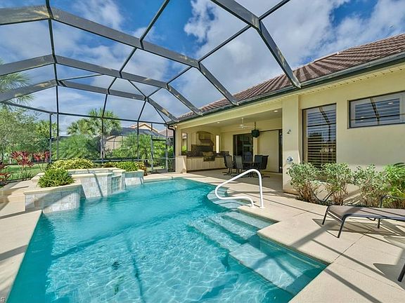 SUNNY SOUTHERN REAR EXPOSURE FOR THIS 3BR+DEN POOL HOME IN VERANDAH! Enjoy peaceful long lake views from your oversized covered lanai area complete with summer kitchen which includes a heated pool/spa along with nice area for sunbathing. This home sits on a larger lot than most of the newer homes in this community. An open floor plan in the main living areas with pocket sliding doors to allow for spectacular views and an open air feel! Relax in the large master suite with his and her walk-in closets and large master bath all located on one side of the house for maximum privacy. There are two additional light-filled bedrooms on the other side of the house with a separate full bath. Many upgrades are included such as plantation shutters, tray ceilings, crown molding and upgraded floor tiles in main living areas. French doors invite you into the den which received a gorgeous upgrade (2017) of built in bookshelves and desk, making this a relaxing library-like retreat to pursue your intellectual interests while looking out of the huge windows at the brand new landscaping; also installed in 2017. New granite countertops and a new black stainless French door with bottom freezer fridge were installed in 2017 combined with a gas range make this a chef's delight for entertaining! Additional professional landscaping including 3 new trees (Joy Perfume, Buddha Belly Bamboo and Triple Pygmy Date Palm) were also added in 2017. New pool heater and pump were installed in 2017 as well. Located in VERANDAH which is an upscale country club community in Fort Myers that is attractively landscaped and has more common areas, including miles of walking trails and dog park. Separate membership for 36 holes of high caliber Championship golf, tennis, fitness and clubhouse with dining is available. EXCEPTIONAL VALUE FOR THIS TERRIFIC HOME IN SUCH AN ATTRACTIVE COMMUNITY!