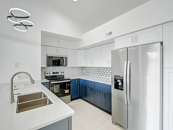 Fully remodeled kitchen with stainless steel appliances, quartz countertops, and stylish two-tone cabinetry