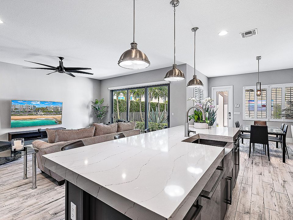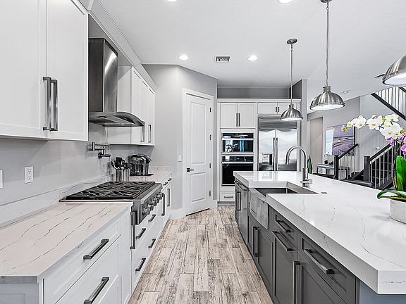 Welcome to your slice of paradise in Palm Beach Gardens! This magnificent 2-story home offers the epitome of contemporary living. Boasting 3 bedrooms, a den/office, 2.5 bathrooms, and a 2-car detached garage, it's the perfect blend of comfort and style. Built in 2021, the home exudes luxury with its upgraded features, including hurricane-rated windows /doors, electric shades and plantation shutters. Step inside to discover the exquisite custom bathrooms with quartz countertops and glass enclosures, along with the elegant Carrara marble flooring. The gourmet kitchen is a culinary enthusiast's dream, featuring an oversized island, gas range, double wall oven, and abundant storage. Outside, the meticulously landscaped grounds and hand-polished Mexican river rocks create a serene oasis.