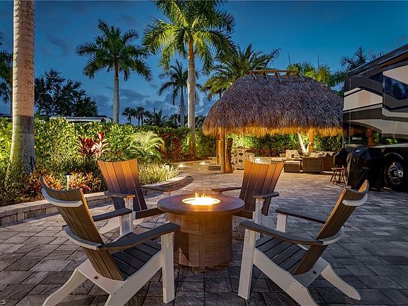 Lot 96 - Welcome to your Oasis! You drive through the gates of Naples Motorcoach Resort and head to your oversized corner lot of complete paradise! As you drive down the Royal Palm lined road you get to your very private property. The first thing you notice is that your property has not one, not two but Four Royal Palms. You marvel at the thick clusia that border your oversized corner property offering incredible privacy. Your privacy also extends to the front of your property as you face clusia as you look out of your motorcoach, so tropical and plush. Your property is so well designed that you have room for an oversized SUV and a car in front of your coach. Your fully paved property has several areas for entertaining, sitting or just relaxing. You continue past all of your landscaping and head to your oversized and NEW tiki!!! Imagine entertaining your friends in this amazing private space, listening to the birds or watching your tv in complete comfort. But wait, you would like a swim, can we talk location? You are steps away from one of the two satellite pools, so after your swim you slip into the spa and relax your muscles. Now that you have soaked away, you decide to shower right there in the bath house at the pool. Now all ready for the evening you walk the steps back to your oasis. You have an area for a fire table so you light it sit down and enjoy the paradise that is yours. Wait, Fido wants to go to the dog park prior to your retiring for the evening, once again you are in the best location, you have a short walk to the dog park! After Fido has a good run around you walk back to your coach and you relax looking at your tropical foliage all lit up with your custom landscape lighting. You cannot imagine a better way to spend your winter months. Wait you want to earn income? You put the lot in the rental program so that you have cashflow while you are not utilizing and it makes you feel good that you get to share your oasis with others. Naples Motorcoach Resort is a Class A only, gated resort and boasts a beautiful infinity pool, hot spa, exercise room, men and ladies' saunas and a kitchen that owners can use. A clubhouse for events whether sponsored by the resort or you can reserve for your own gathering. Two satellite pools each with a hot spa their own rest rooms and a laundry room. We can't forget your furry best friend; the resort also has a dog park!
