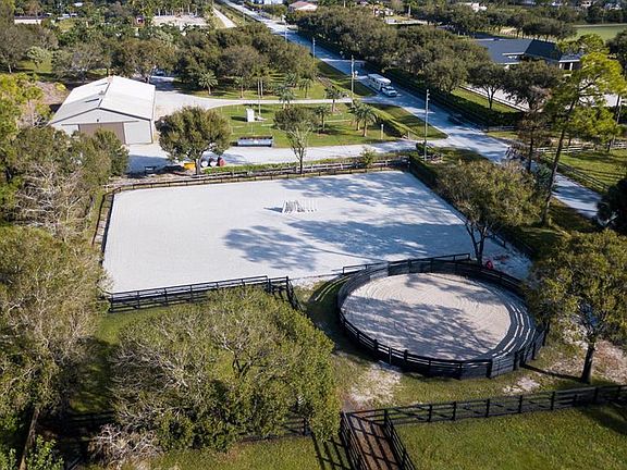 This serene equestrian farm has an amazing location just across Southern Blvd on a paved road and is only about a 10 minute drive to WEF. The house has its own private gate & driveway, and includes 3bdr/2bath with an additional 4th bedroom added in the garage (can easily be converted back). Fully furnished with a fenced in backyard for your 4 legged friends! There is one 6-stall barn and one 10-stall barn, an all-weather 150 x 120 ft GGT arena (bigger arena at neighbors might be available for an additional cost), a 60' round pen and 5 grass paddocks. Treadmill shed, 5 wash racks, two RV hook-ups, separate storage for hay & shavings and plenty of space for parking. *Price reflects a 4 month seasonal lease for the entire farm.