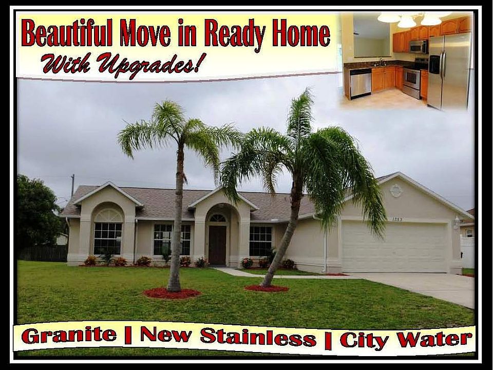 You must see this super clean, move-in ready home that has been freshly painted inside & out! This 3 bedroom, 2 bath home features an open concept, vaulted ceilings, stainless steel appliances, & granite countertops. Home is built of sturdy concrete block, has hurricane shutters & new storm rated garage door (2019). No carpet! All flooring is tile & laminate. The backyard has vinyl fencing & numerous fruit trees. Plenty of outdoor space to enjoy your favorite activities & host a great bbq. No HOA! Home has screened lanai, new insulation (2021), Roof (2014), A/C (2016), Water Heater (2017), & Security Cameras. You don't want to miss this great opportunity to make this your new home. Located on a quiet street in NW Palm Bay very convenient to Heritage Parkway. Make your appointment today!