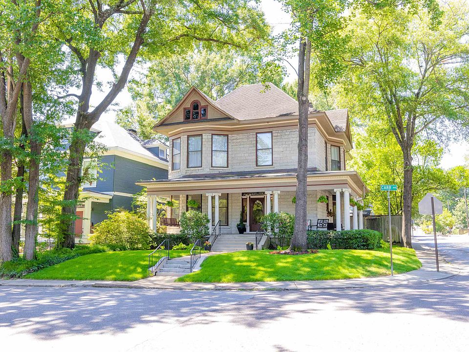 Don't miss the Charm and Beauty of this turn of the Century American Four Square with beautiful Victorian features. The welcoming front porch invites you into a grand foyer with soaring ceilings throughout and over 3800 sqft of living space. The newly updated HVAC keeps this 5bedroom 3bathroom home comfortable in all seasons. There's four spacious bedrooms upstairs and the guest bedroom downstairs. The Guest House gives options for income potential.