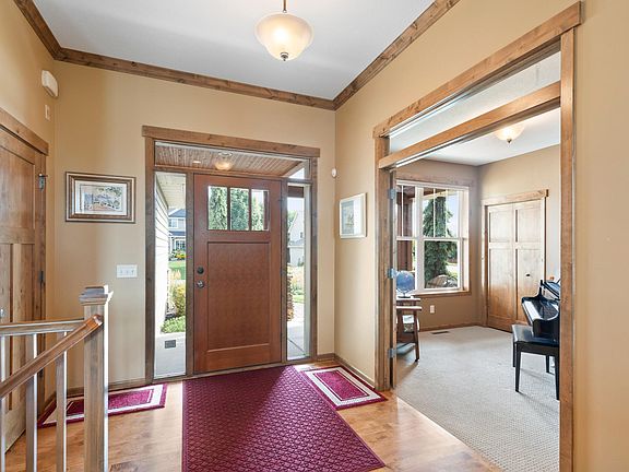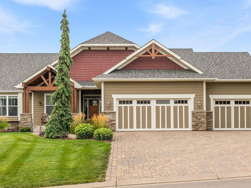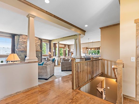 You will fall in love with this gorgeous 5-bedroom rambler that offers beautiful details inside and out! Beautifully landscaped yard with a cozy front porch welcomes you into the home. Inside you'll find exquisite woodwork details throughout the home, 2 stone fireplaces, spacious living spaces, a gourmet kitchen with new stainless appliances and a 9' island and plenty of windows offering wonderful natural light. Spacious main floor primary suite w/ensuite bath that includes heated tile floor, a jetted tub & separate tile shower. Office, additional bedroom and laundry room with new washer and dryer on main floor. Walkout lower level is perfect for entertaining and includes a full bar, projection screen to enjoy movie nights, 3 more bedrooms & a full bath. Enjoy the outdoors & grilling on the deck and paver patio with a fire pit. Heated 3 car garage. Don't miss your chance to make this beautiful home your own!