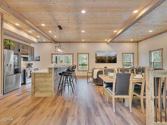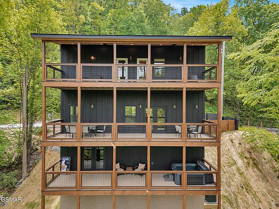 cathedral ceilings, hand-stained trims and doors, recessed lighting throughout, electric fireplace and large windows that fill the space with tons of natural light. The luxurious fully stocked Chef's kitchen will make preparing meals for yourself or your guests an unforgettable experience with plenty of space to move around, an abundance of 42' cabinetry, beautiful quartz counter-tops and premium LG Smart stainless steel appliances. The laundry space and 1/2 bath are also on this level. French doors on this level allow to swiftly transition onto the oversized deck for gorgeous panoramic views of the the Smoky Mountain skyline. The anticipation of fun family game nights begins as you descend onto the lower level where you'll discover the game room as the center piece complete with a pool table, accompanying theater and a set of doors leading to the deck and hot tub. Enhancing the experience on this level are two well-appointed large Ensuite Bedrooms, a King and a Queen, each complete with private bathrooms featuring high end finishes like custom made cabinets, natural slate tile surround in the shower, blown glass sink, and all natural pine clad ceilings and accents. As you make your way back up onto the lofty upper level you'll discover two additional and exquisitely furnished King Ensuite bedrooms, each with walk-in closets and private bathrooms showcasing tile surround tub/shower ensuring a luxurious experience and comfort for residents and guests alike. Ample Parking on the stamped concrete driveway with plenty of space for multiple vehicles ensures convenience for all visitors. Not just a home, but with potential to become a rental success story, this magnificent three-level home has more than enough room for 12 guests for family fun year round seeking the ultimate mountain experience.
