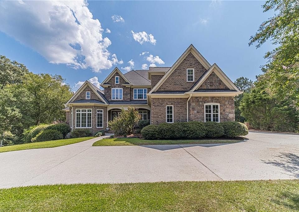 Don't miss this gorgeous home situated on a hill overlooking 7.39 acres! The property is a perfect balance of close-in, privacy with room for pets, horses and livestock. This brick and stone facade home sits back from a quiet road, nestled among a wooded wonderland. Welcome guests to your home by greeting them on the front porch and leading them into the foyer, where they can enjoy views of the formal living and dining rooms. Both spaces feature bay windows that flood the rooms with natural light, highlighting the hardwood floors that extend throughout the main level. Continue into the family room, where soaring ceilings, a wall of windows, and a large, cozy fireplace create a welcoming atmosphere. The chef's kitchen is perfect for entertaining, with expansive granite countertops, a 6-burner stove, and full-sized refrigerator and freezer. Adjacent is a spacious keeping room with a floor-to-ceiling stone fireplace and beamed ceiling. The recently replaced outdoor deck offers a stunning view of the in-ground pool, hot tub, pool house, and outdoor fireplace. The pool house is equipped with a full bathroom for added convenience, and the saltwater pool equipment has been upgraded. The primary bedroom is located on the main floor and features tray ceilings and access to a private outdoor deck, offering a peaceful retreat. A large sitting room with a wet bar and desk area is warmed by a fireplace that also warms the master bathroom. Upstairs, there's another suite-like bedroom with a sitting area and attached bath, plus three additional bedrooms and baths. The terrace level includes a versatile living area and a plumbed kitchen area and full bath along with ample unfinished space for storage. Above the detached garage you will find a one bedroom apartment with a full bath and kitchen ideal for guests, a studio, or office use. The property is fenced and bordered by Flat Creek. The acreage also includes two barns, upper barn with 4 stalls as well as a tack room and feed room, and a lower barn with 6 stalls. Currently houses horses but could easily be adapted to farm animals. Finally, there is a pump that runs from the creek to fill the pond. Current owner chooses not to use it; however, it can be set up very easily. The HVAC systems for all levels have been replaced. Must see to fully appreciate, a rare opportunity to own a truly unique once-in-a-lifetime property!