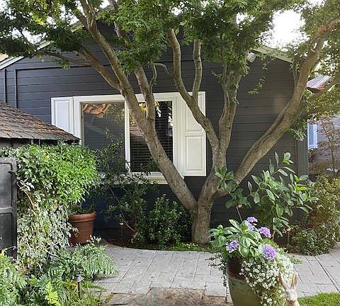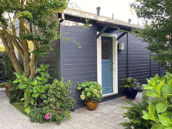 Newly remodeled, detached from main home "L shaped" studio cottage with private entry and entry gate, off-street parking * * * Non - Smoking * * * Separate outdoor patio with dining table, two 9 foot market umbrellas with integrated lighting, chairs and chaise lounges, outdoor mood and task lighting New Phantom entry screen door New interior paint throughout New vinyl wood flooring throughout Thermostatically controlled gas heater New refrigerator and hutch New kitchen faucet Garbage disposal 4 gas burner cooktop (electronic ignition) with oven & broiler New recessed lighting in kitchen, living, sleeping areas Entirely new shower enclosure & pan with new plumbing, fixtures and toilet Water, gas, electric utilities, garbage p/u, gardener paid by h/o Washer & dryer on site Hardwired smoke detector Dwelling meets all city and county building code requirements