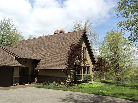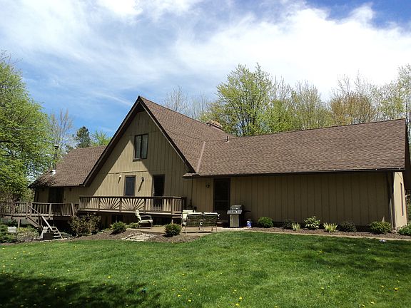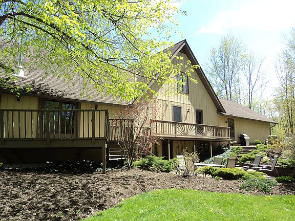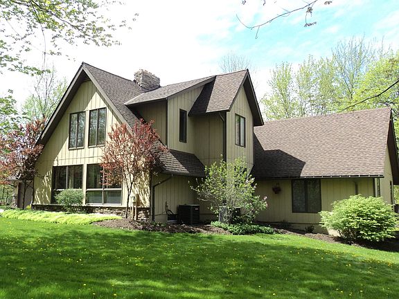 This 4 bedroom, 2 full and 2 half bathroom home with over-sized 2 car garage is beautifully remodeled and upgraded in neutral decor throughout. The open concept main living area features a two story stone, wood-burning fireplace, hardwood flooring and floor to ceiling windows. The kitchen offers granite counters, custom maple cabinetry, ceramic tile and stainless steel appliances. Hardwood, cathedral ceiling with exposed wooden beams, a wood burning stove, and deck access are highlights of the spacious first floor master suite and large glamour master bathroom. The lower level has an additional 5th bedroom, living room with wood-burning fireplace, half bathroom and can be accessed through a separate outdoor entrance or through the home. The lower level also offers a spacious recreational room that has many possible uses and additional outdoor access with over-sized double doors. The 2.24 acres of property are partially wooded and beautifully landscaped with a waterfall feature near the two stamped concrete patios and deck. The home includes ample storage space with the numerous closets throughout, finished attic area off of bedroom 3, and large attic above garage. The roof, stone outside and inside,Kinetico water system, electric furnace/AC and heat pump, all cabinetry, plumbing fixtures, lighting, appliances and more are all 5 years or newer!